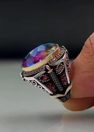 Anillo de plata pura con un diseño llamativo. Su piedra se cambia su color de piende el tiempo - Piedra central multicolor. - Detalles grabados en la montura.