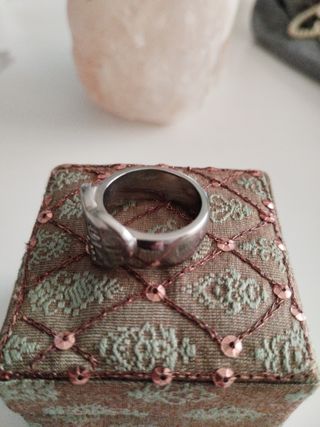 Anillo de lobo de acero inoxidable. Es un anillo de metal con un diseño de lobo con las huellas en los laterales. Talla 12 americana. Aprox unos 60 mm de circunferencia. - Diseño de lobo. - Metal resistente.