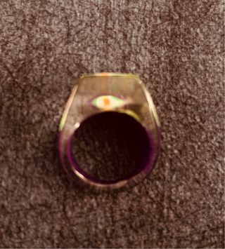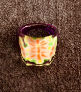 Anillo de fantasía con un diseño vibrante y llamativo. - Base morada translúcida. - Decoración con motivos florales en tonos naranja, amarillo y verde. - Acabado brillante. - De resina.