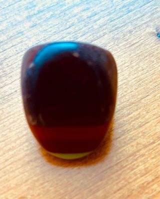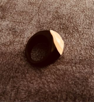 Anillo grande de fantasía con un diseño llamativo. - Pieza única con detalles en tonos marrones y rojos. - Estilo llamativo y moderno. - De madera y resina.