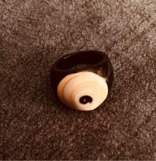 Anillo de fantasía con un diseño llamativo de resina. - Diseño de ojo turco. - Banda del anillo en color negro. - Detalle central en tonos beige y negro.