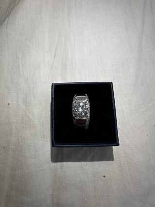 Elegante anillo con moissanita central y detalles brillantes en el aro. - Piedra principal: Moissanita. - Diseño: Aro con incrustaciones. sin uso en perfecto estado
