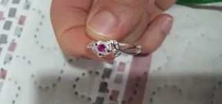 Anillo con diseño de rosa y detalles en plata. - Piedra central color rosa. - Pequeñas piedras incrustadas.