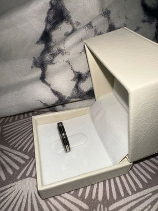 Precioso anillo de metal en color plata y negro. Se encuentra en buen estado. - Diseño elegante y clásico. - Talla 17,7 mm.