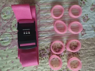 Set de accesorios para equipaje. - Correa de maleta resistente con candado de combinación. - Incluye 16 anillas de silicona para las ruedas, decoran, protegen y reducen ruido