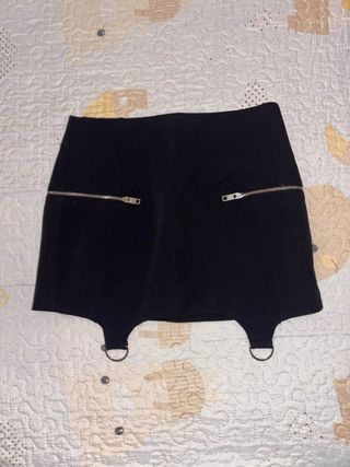 Falda corta negra de Bershka con detalles modernos. - Dos bolsillos delanteros con cremallera plateada. - Dos trabillas inferiores con anillas metálicas.
