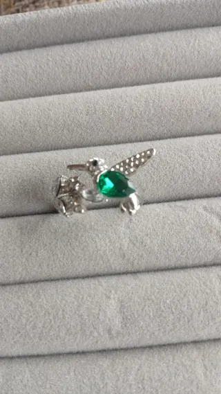 Anillo con un diseño de colibrí posado en una rama. La piedra principal es de color verde intenso y el cuerpo del colibrí está adornado con pequeñas incrustaciones brillantes. - Diseño detallado de colibrí. - Rama con hojas y pequeñas flores. - Piedra central en forma de lágrima.