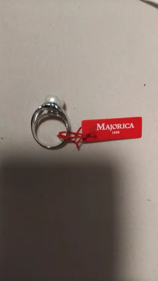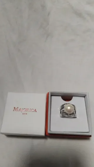 Elegante anillo de la marca Majorica con una perla. - Diseño en plata. - Perla central.