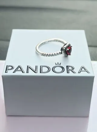 Anillo de Pandora con diseño inspirado en Maléfica de Disney. - Diseño de corazón con gema roja. - Detalles de pequeñas gemas alrededor del corazón. - Montura dorada. Como nuevo en su caja original