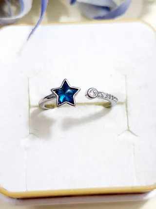 Anillo de plata con un diseño de estrella y cristal azul. - Diseño de estrella con cristal azul. - Detalles de circonitas brillantes en la otra punta. - Talla ajustable para mayor comodidad. Nuevo sin estrenar y se vende con caja de regalo