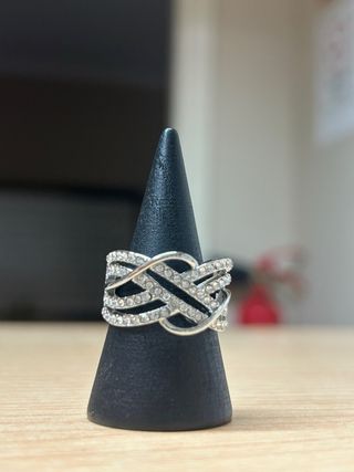 Elegante anillo con un diseño entrelazado y adornado con pequeñas circonitas brillantes. - Material: Acero inoxidable. - Talla: 17.5 mm de diámetro interior.