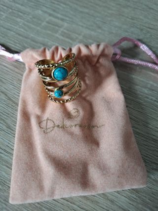 Precioso anillo de acero de la marca Dekorazón ajustable. Dorado con detalle de turquesas. Muy ponible con todo. Totalmente nuevo sin estrenar y en su bolsa. Elaborado con materiales de alta calidad, como acero inoxidable. Pensado para acompañarte en tu día a día sin perder su brillo ni estilo. Se entrega con su bolsa original.