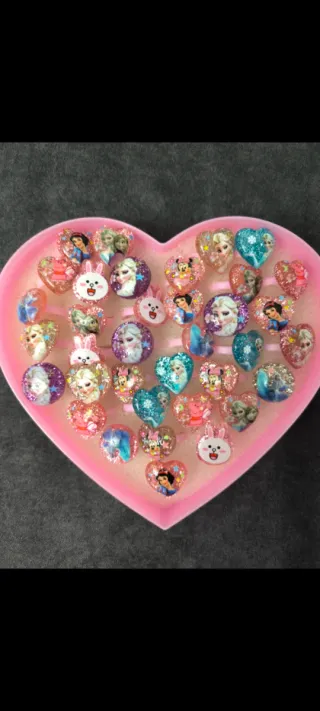 Conjunto de anillos infantiles con diseños de personajes Disney. - Incluye personajes como Elsa, Anna y Minnie Mouse. - Diseños variados con corazones y figuras. - Talla ajustable para mayor comodidad.