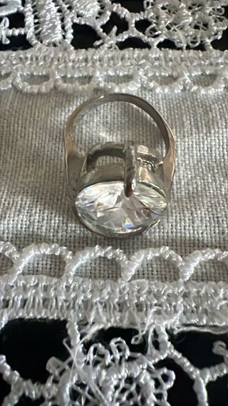 Anillo con un diseño elegante y una piedra central brillante. - Montura de metal plateado. - Piedra de gran tamaño con facetas.
