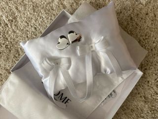 Elegante almohada para anillos de boda, adornada con dos corazones plateados y lazos blancos. Material satinado. Sin estrenar porque nos regalaron otra personalizada.