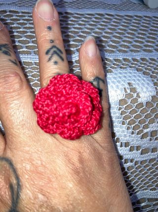 Anillo artesanal con un diseño de rosa tejido a crochet. Una pieza única y llamativa. - Elaborado a mano con hilo. - Diseño floral. - Tono vibrante.(Se Realiza por Encargo)Mas cositas en mi perfil..~Precio por la unidad..