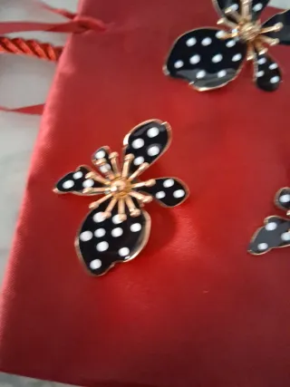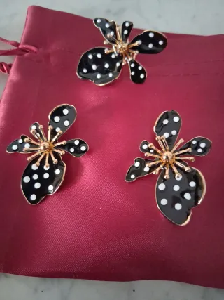 Conjunto con un diseño floral llamativo. - Pendientes y anillo a juego. - Diseño de flor negra con lunares blancos. - Detalles en tono dorado. Resina acero y aleación. Ideales para cualquier ocasión. Atemporal y versátil.