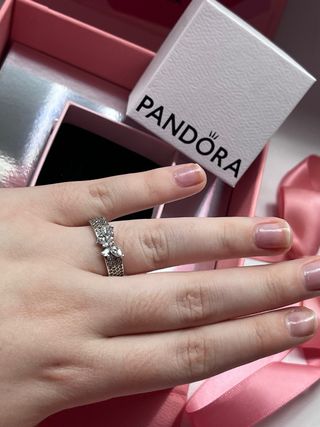 Elegante anillo de la marca Pandora. - Diseño delicado con una pequeña circonita. - Cadena fina. - Color plateado.