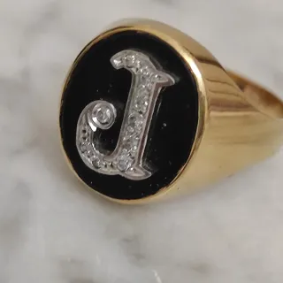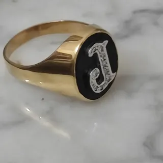 Elegante anillo sello con la inicial J engastada en diamantes naturales sobre una base de ónix. - Oro de 18 quilates. - Diamantes naturales. - Piedra de ónix.