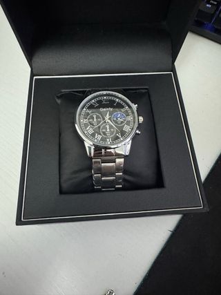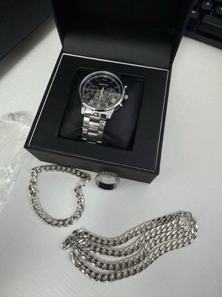 Vendo elegante set completo para hombre en color plata, ideal para regalo o para quien quiera un look moderno y llamativo. Incluye: Reloj de cuarzo con diseño tipo cronógrafo Collar de cadena gruesa Pulsera a juego Anillo metálico Diseño masculino, sofisticado y versátil, perfecto para combinar con ropa casual o elegante. El reloj es cómodo, ligero y fácil de usar, con un acabado brillante que destaca. El set es nuevo, sin usar, tal como se ve en las fotos. Ideal para cumpleaños, regalos o para uso personal