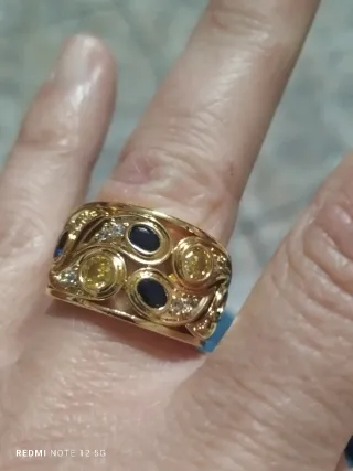 Elegante anillo de estilo vintage con baño de oro. Presenta un diseño intrincado con detalles en piedras azules y amarillas, rodeadas de pequeños cristales. - Diseño con motivos florales y curvos. - Acentos de zafiros y citrinos. - Detalles de pequeños diamantes o circonitas.