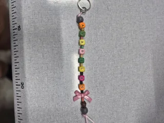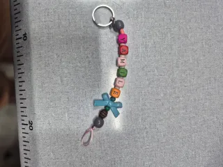 Llavero personalizado con cuentas de letras y un bonito dije de flor. - Cuentas con letras para formar un nombre o palabra. - Dije en forma de flor. - Anilla metálica para llaves.