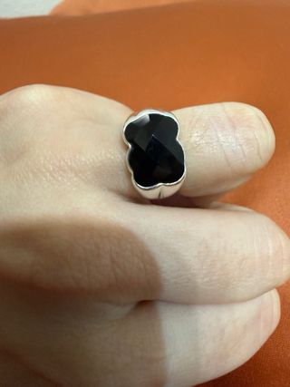 Anillo de la marca Tous con diseño de oso. - Elaborado en plata. - Detalle de piedra onix. - Plata algo deformada en la base por el uso. Se puede arreglar y puesto no se nota nada. - Adjunto certificado de autenticidad.