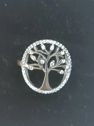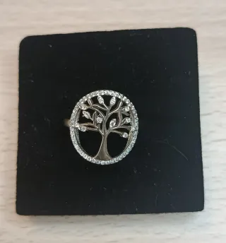 Elegante sortija de plata con diseño de árbol de la vida. El contorno está adornado con pequeñas circonitas que aportan un brillo especial. - Material: Plata - Diseño: Árbol de la vida - Detalles: Circonitas incrustadas - El tamaño está en la foto. - Nuevo sin etiqueta