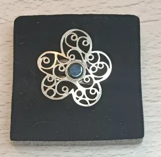 Sortija de plata con un detalle central de azabache. - Diseño floral calado. - Piedra central de azabache. - Nuevo sin etiqueta con estuche y certificado. - La medida está en una foto