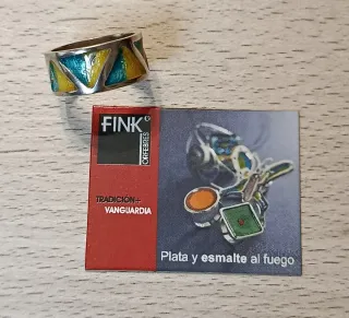 Sortija de plata con un diseño moderno y colorido. - Nueva con certificado y estuche original. - Elaborada en plata. - Decorada con esmaltes a fuego. - Marca: FINK ORFEBRES. - La medida está en una foto.