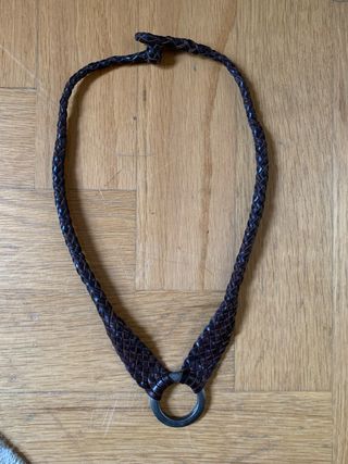 Collar de cuero con un diseño trenzado y una anilla metálica. - Material: Cuero - Color: Marrón - Cierre: Nudo - Detalle: Anilla metálica