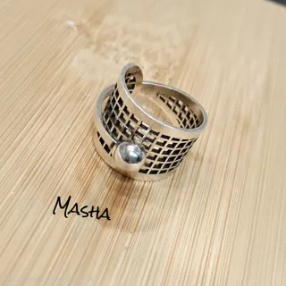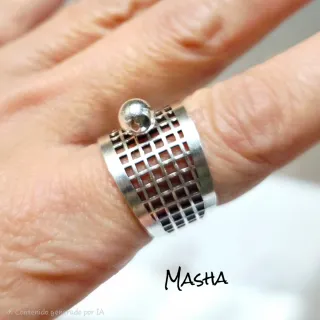 Anillo de diseño con rejilla de rectángulos y bola en la parte superior. Ajustable a cualquier dedo. Tiene un acabado en plata pura de 12 micras.
