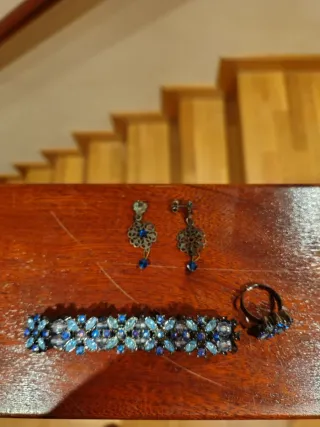 Elegante conjunto de joyería que incluye una pulsera, un par de pendientes (en uno de ellos le falta la piedrecita central) y un anillo. - Diseño intrincado con detalles florales. - Adornado con cristales en tonos azules y plateados.