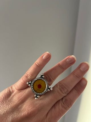 Anillo de plata con un diseño de amuleto indio. Presenta un ojo central con fondo amarillo y un punto rojo. - Diseño circular con detalles. - plata adaptado a talla 12 pero es ajustable