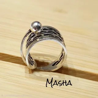 Anillo en zamak con baño de plata. Tiene un diseño moderno y ajustable. Su banda presenta un patrón calado que le da un toque único. - Diseño calado con líneas negras. - Bola decorativa en la parte superior.