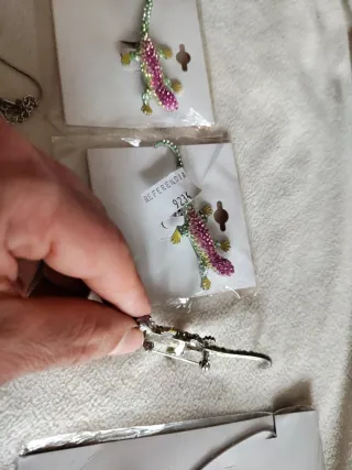 Conjunto de bisutería variado que incluye broches, collares y anillos. - Broche con diseño de mariposa y libélula. - Collar con colgante de flor. - Anillo plateado. - Tres pares de pendientes con diseño de lagarto. Cangrejo, cierre roto