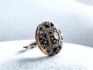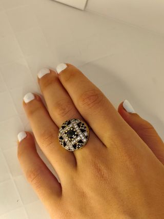 Elegante anillo vintage con diseño de flor, elaborado en plata 925. - Detalles en piedras negras y blancas. - Acabado en dorado y plateado. - Estilo artesanal.