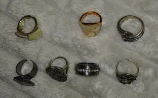Conjunto de varios anillos con diseños variados. - Anillo con piedra rectangular y montura dorada. - Anillo con diseño floral y piedras oscuras. - Anillo con piedras rojas y plateado. - Anillo ovalado con incrustaciones. - Anillo con diseño de filigrana y piedras. - Anillo ancho con detalles. - Anillo con diseño de eslabones y piedras. Se puede vender por separado.