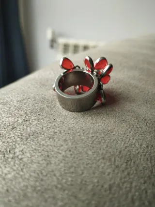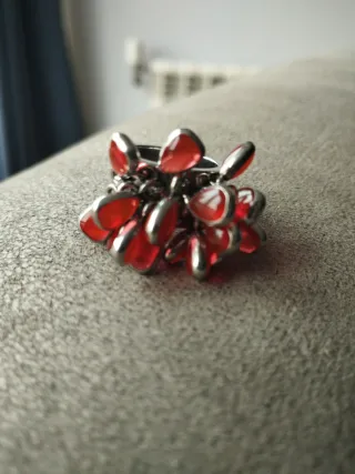 Anillo con un diseño llamativo y elegante. - Detalles en forma de pétalos o gotas. - Combinación de tonos rojos y plateados.