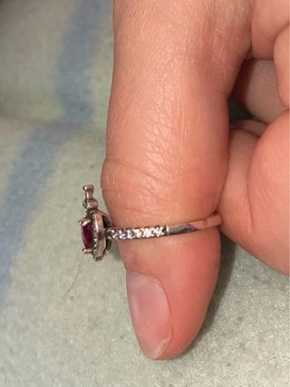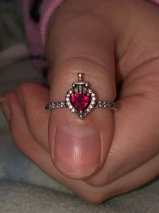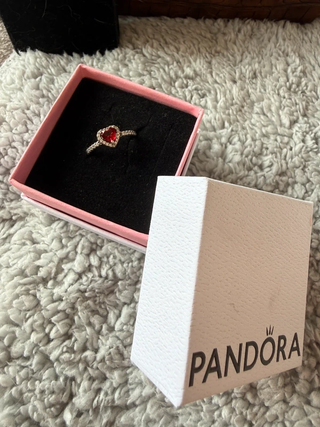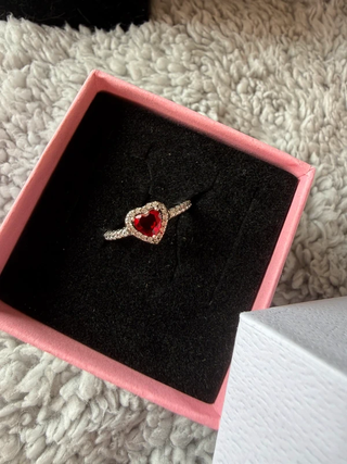 Anillo de Pandora con un diseño de corazón rojo. - Piedra central en forma de corazón. - Detalles de pequeñas piedras alrededor del corazón y en la banda. - Banda del anillo con un acabado plateado.