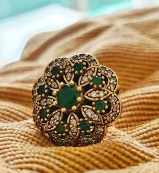 Elegante anillo cóctel hecho a mano con baño de oro y detalles en piedras verdes y azules. - Material: Plata 925 con baño de oro. - Diseño: Estilo cóctel con piedras incrustadas. - Ajustable: Talla única que se adapta a diferentes dedos.