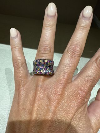 Precioso anillo Tous de diseño elegante y moderno. Es una pieza única y llamativa. - Está elaborado con circonitas de diferentes colores. - Presenta un diseño de doble línea de piedras. - La montura es de metal oscuro.