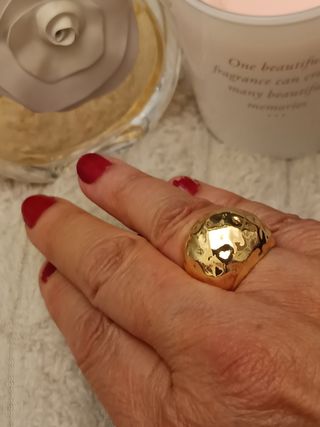Elegante anillo con un diseño martillado que le da un acabado único y brillante. - Material: Metal con baño dorado. - Estilo: Moderno y llamativo.