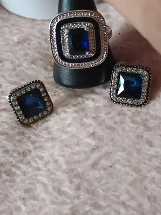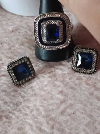 Conjunto de anillo y pendientes con un diseño elegante y llamativo. - Anillo con piedra central azul y detalles de pedrería. - Pendientes a juego con piedra azul y pedrería.