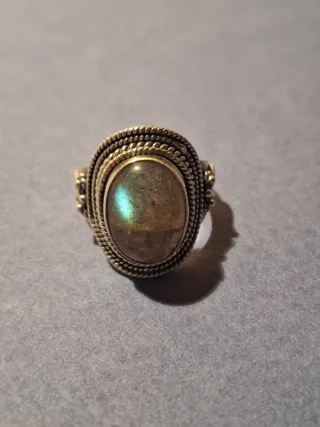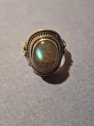 Anillo con una piedra central de labradorita y detalles en plata. - Diseño ovalado. - Montura con filigranas.