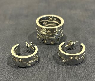 Conjunto de joyería de acero con un diseño floral, compuesto por anillo y pendientes a juego con diseño calado. Muy poco uso. Medidas anillo: 1,4 cm de ancho. Diámetro interior 1,6 cm y exterior 2 cm. Medidas pendientes: 1,7 cm x 0,7 cm.