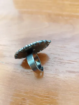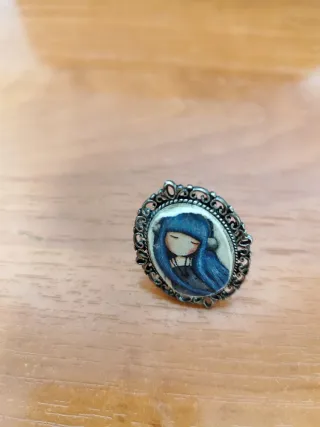 Anillo con un encantador diseño de una chica con pelo azul. - Marco plateado con detalles ornamentales. - Imagen central ovalada con ilustración. - Estilo vintage.