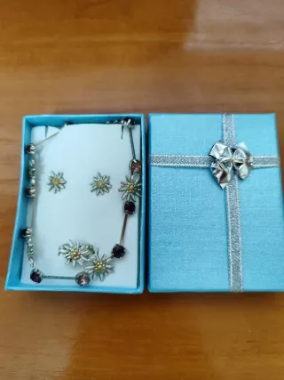Precioso conjunto de bisutería con diseño de Edelweiss. - Incluye collar, pendientes y anillo a juego - Detalle de piedras moradas. - Acabado plateado.