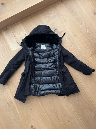 Anorak acolchado con acabado brillante y detalles de pelo en la capucha. Muy calentito. El pelo de la capucha se puede quitar también. - Cierre de cremallera frontal. - Bolsillos laterales con cremallera. - Logo de la marca en el pecho.