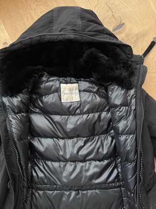 Anorak de la marca Moncler en color negro. Cuenta con un diseño acolchado en el interior y capucha. - Capucha con forro de pelo. - Cierre de cremallera frontal. - Bolsillos laterales.